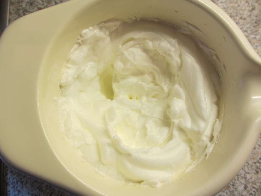 Schlage nun das Eiweiß bis es steif ist. Der Eischnee ist fertig, wenn du die Schüssel auf den Kopf drehen kannst ohne es herausfließt.