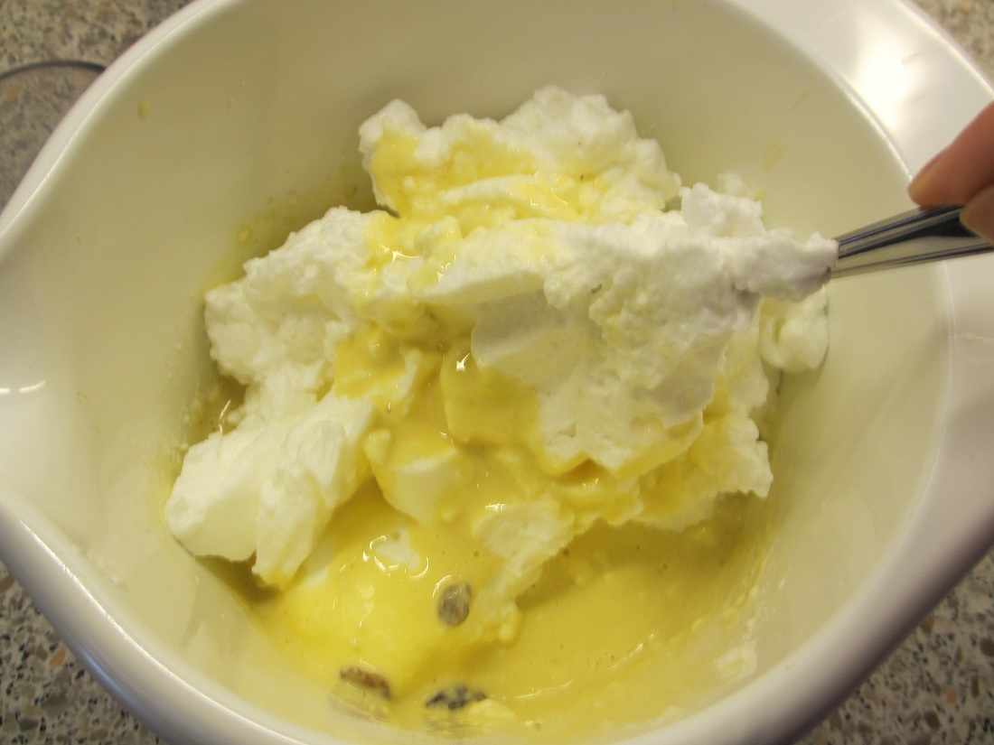 Zum Schluss gibst du den Eischnee mit einem Löffel zum Teig und hebst ihn unter.
