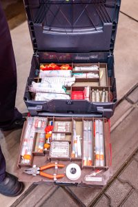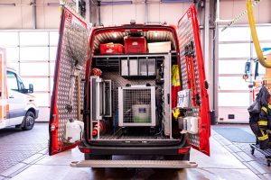 Für ihre Arbeit haben die Feuerwehrleute ein besonderes Auto: den leuchtend roten Tiertransporter. Im Inneren verbergen sich Käfige in verschiedenen Größen für Hunde, Ziegen, Katzen, Marder, Frettchen, Schlangen oder Greifvögel. Bis zu drei oder vier Tiere können gleichzeitig transportiert werden. Das Auto ist klimatisiert, es bleibt im Sommer kühl und ist im Winter warm. Im hinteren Teil sind Hilfsmittel verstaut: zum Beispiel Schlingen, Maulkörbe, Fangnetze und Käscher. „Wir haben auch verschiedene Schutzkleidung. Aber wir versuchen, erst einmal ohne auf die Tiere zuzugehen“, sagt Holger Schnell. Dann haben sie weniger Angst und sind zutraulicher. Dennoch sind zum Beispiel Handschuhe wichtig, die gegen Krallen und Bisse schützen. Außerdem gibt es einen Medikamentenkoffer mit Schmerz- und Betäubungsmitteln. Bei jedem Einsatz wird in einem Protokoll aufgeschrieben, was genau passiert ist.