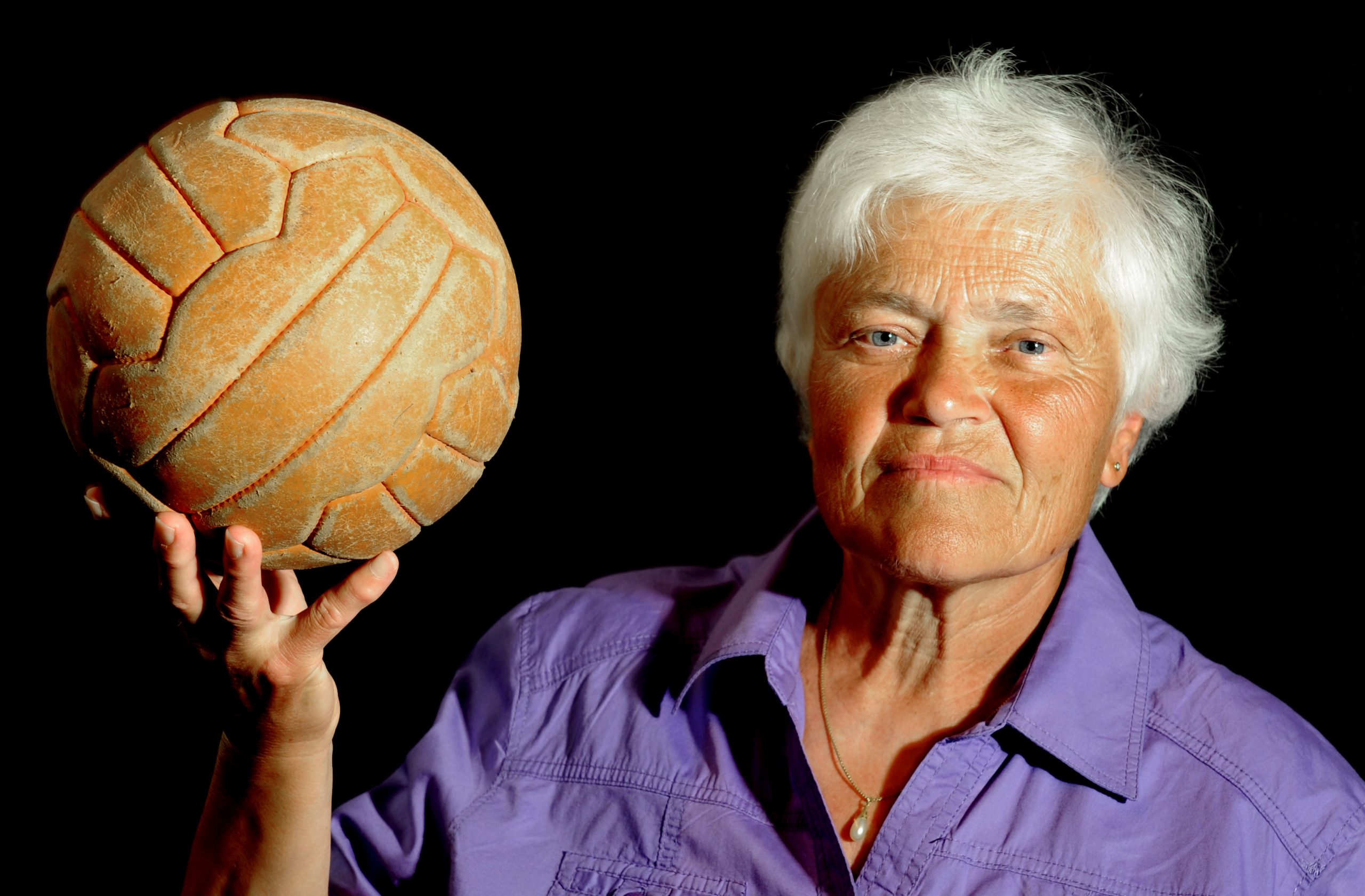 Die deutsche Frauenfußball-Pionierin Bärbel Wohlleben zeigt einen Lederball aus den fünfziger Jahren. Foto: picture alliance / dpa