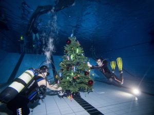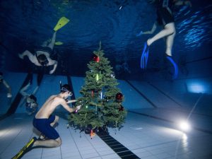 Taucher der Tauchsportgemeinschaft Porz schmücken beim traditionellen Schatzkistentauchen einen Plastikweihnachtsbaum. Foto: Matthias Heinekamp
