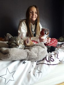 In diesem Jahr haben meine Eltern zum Glück frei an Heiligabend. Deswegen können wir abends feiern und zu Oma und Opa fahren. Die wohnen nicht so weit weg von uns. Aber egal wann wir feiern: Es gibt immer erst nach dem Essen Geschenke. Zuerst gehen meine Mutter, meine Oma und ich in die obere Etage und halten nach dem Christkind Ausschau. Bisher haben wir es aber noch nie gesehen – es war immer zu schnell! Unten klingelt es dann nämlich, wenn es die Geschenke gebracht hat. Übrigens hängen wir dieses Jahr kein Lametta an den Baum. Wir haben nämlich zwei kleine Katzen und Angst, dass sie sich daran verschlucken könnten.