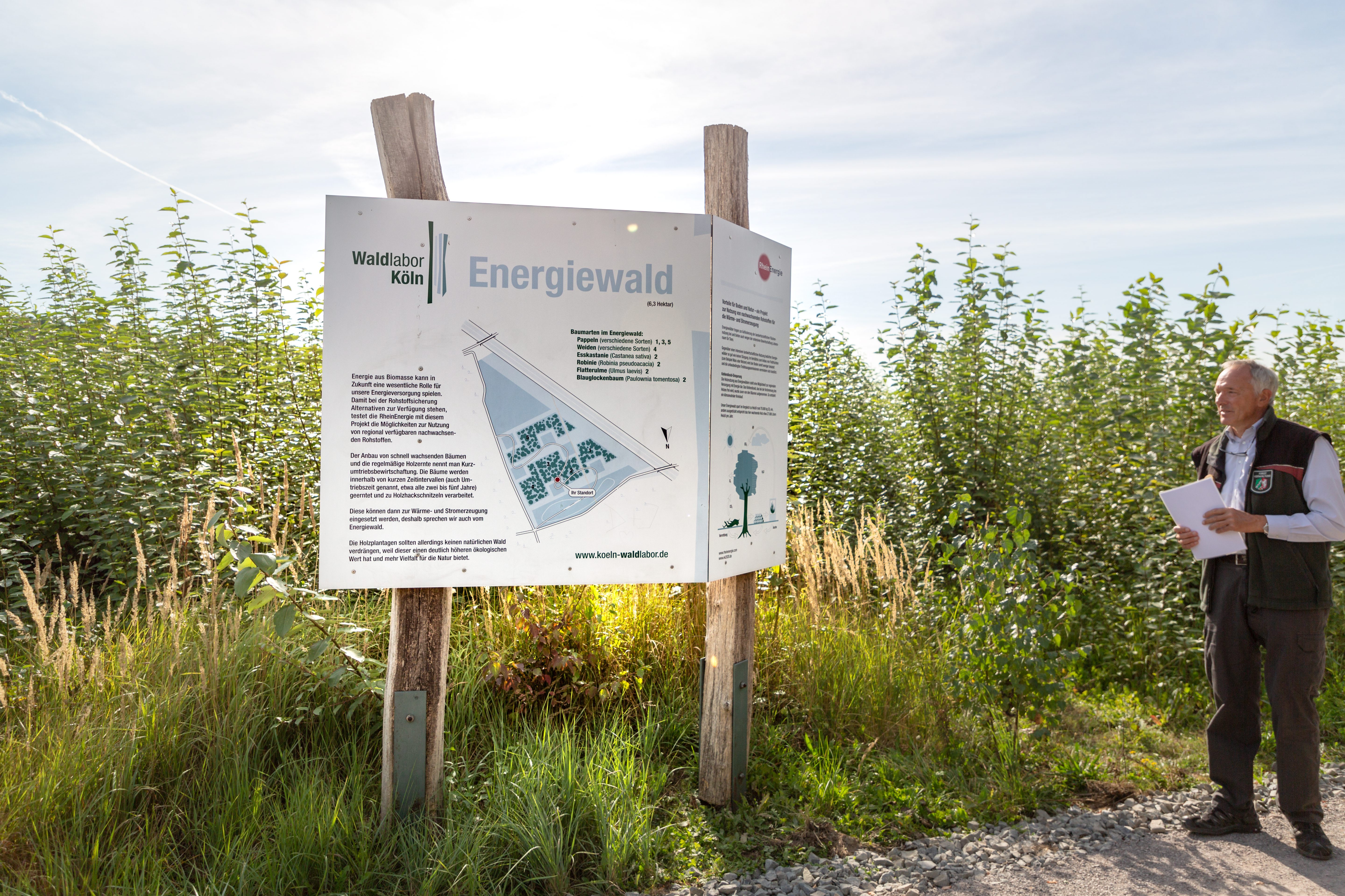 17.09.2018, Köln: Ein Schild weißt auf den “Energiewald” im Waldlabor der Stadt Köln im Ortsteil Marsdorf hin. Die hier gepflanzten Bäume wachsen sehr schnell und werden dann geerntet um zum Heizen verbrannt zu werden. Auf der Fläche forscht die Stadt am Wald der Zukunft. Foto: Matthias Heinekamp – Wald, Stadt Köln, Klima, Baum, Natur, Grünfläche