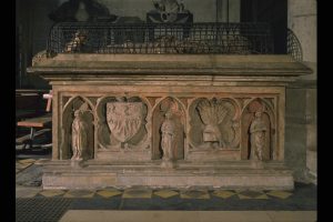 Eigentlich sind im Dom nur Menschen begraben, die einen direkten Bezug zur Kirche haben, wie etwa Erzbischöfe oder Heilige. Im Mittelalter wurde diese besondere Ehre aber noch jemandem zuteil: dem Grafen Gottfried von Arnsberg und zwar im Jahr 1371. Sein Grab kann man auch se-hen: Es ist ein großer Sarg aus Sandstein, eine sogenannte Tumba. Darauf ist eine Figur abgebil-det. Sie stellt den Grafen dar und zwar in voller Ritterrüstung. Der Graf wurde im Dom begraben, weil er sein Erbe der Kirche überließ – er hatte nämlich keine Kinder.