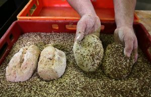 Dieses typische Osterbrot schmeckt besonders saftig. Es besteht zu 25 Prozent aus Möhren. Sie werden vom Obsthändler täglich frisch zur Backstube geliefert. Denn wenn sie nicht frisch wären, würden die Kunden das beim Kauf des Brotes schnell bemerken. Der Teig wird zunächst mit Hilfe des Teigschabers in Form gestoßen und dann mit Wasser beträufelt. Sonst würden die Körner nicht an der Kruste halten. Dann kommt das Möhrenbrot für eine Stunde in den Ofen.