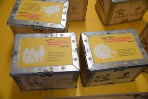 Im Bereich „KopfMut“ rätseln und puzzeln die Mädchen und erfahren dabei zum Beispiel, welche Stadt tolle Ideen gegen Hitze hat, und von mutigen Menschen, die Fragen stellen. Die beiden sitzen auf dem weichen Teppich und die Köpfe rauchen. „Die Rätsel sind kniffelig. Es ist wichtig, seinen Kopf zu benutzen“, sagt Philipa. „Und nachzufragen“, ergänzt Selma. Gegenüber im Raum ist die Station „OhrMut“. Selma presst ihr Ohr an eine der Geschichtenkisten und hört genau hin. Philipa sagt: „Hier geht es ums Zuhören!“ Gemeinsam lösen sie die Rätsel.