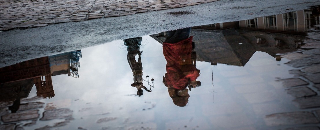 Die Statue der Justitia auf dem Gerechtigkeitsbrunnen wird am 13.10.2014 in Frankfurt am Main (Hessen) nach einem regnerischen Morgen in einer Pfütze auf dem Römerberg gespiegelt. Foto: Frank Rumpenhorst/dpa +++(c) dpa – Bildfunk+++