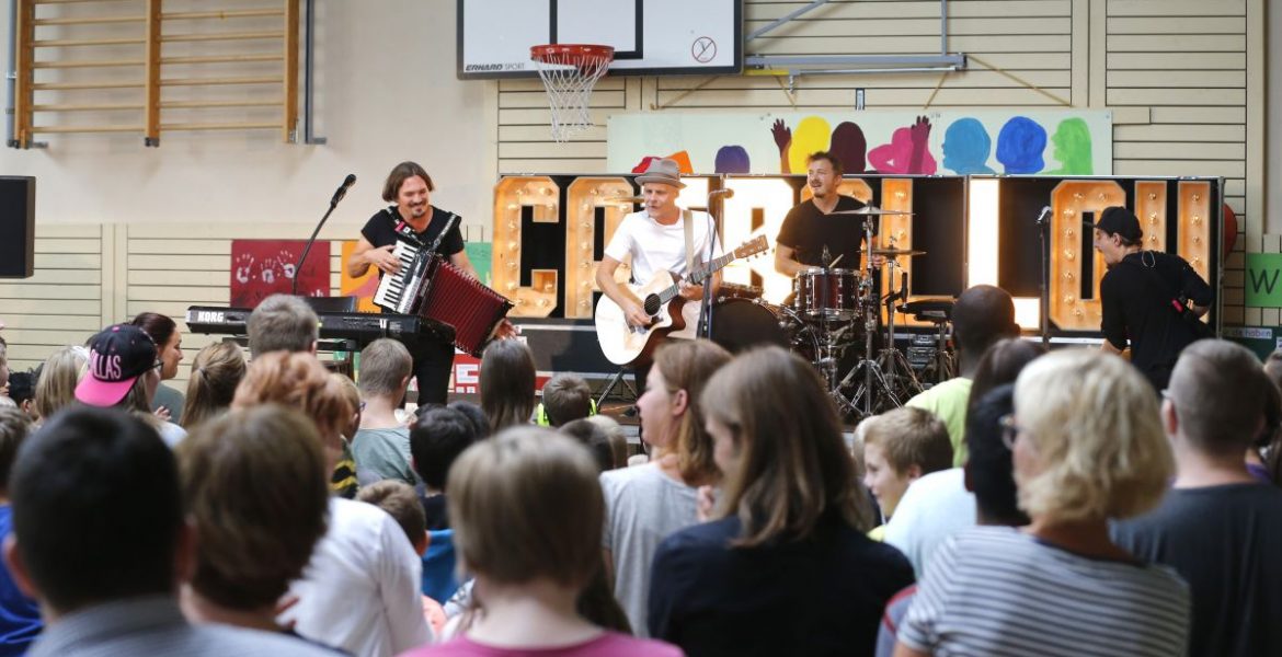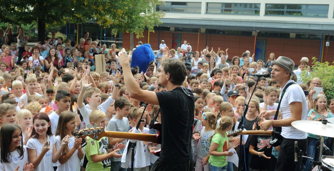 „Das ist ja eine Riesen-Party hier!“, rief Cat Ballou-Sänger Oliver begeistert. Die Schüler hießen die Musiker herzlich willkommen. Tosender Applaus begrüßte die Band. Während des Auftritts tanzten viele Schüler – immer mittendrin: Duda! Auch von ihm waren die Schüler begeistert und klatschten ihn – aber auch die Band auf der Bühne – immer wieder ab.
