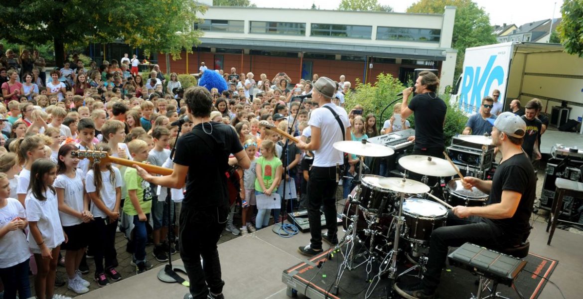 Eine Bühne auf dem Schulhof – und davor die ganze Schüler-Schar. Das Schulkonzert konnte draußen stattfinden. Den Auftritt belohnten die Kinder mit gemalten Schildern, Fan-T-Shirts und begeistertem Jubel. Ob bei „Et jitt kei Wood“ oder „Hück steiht de Welt still“ – viele Kinder lagen sich in den Armen, schunkelten mit, hüpften zur Musik und tanzten wild durcheinander.