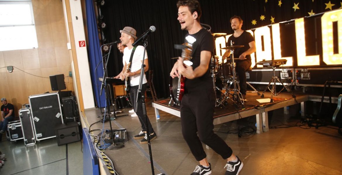 Schilder mit „Cat Ballou – we love you!“, handgeschriebene Fanbriefe mit Herzchen und selbst bemalte T-Shirts mit „Cat Ballou“-Schriftzug: Was war das für ein warmherziger Empfang der Kölner Band! An den drei Schulen, die mit Duda ein Konzert von Cat Ballou gewonnen haben, war die Freude über die Musiker groß: Überall brandeten Jubel und tosender Applaus auf, als die vier Musiker die Bühne betraten. Und ohne mindestens eine Zugabe ließen die Kinder der Förderschule „Zum Römerturm“ in Bergheim, der Ildefons-Herwegen-Gemeinschaftsgrundschule in Köln-Junkersdorf und der GGS in Leverkusen die Band nicht gehen.