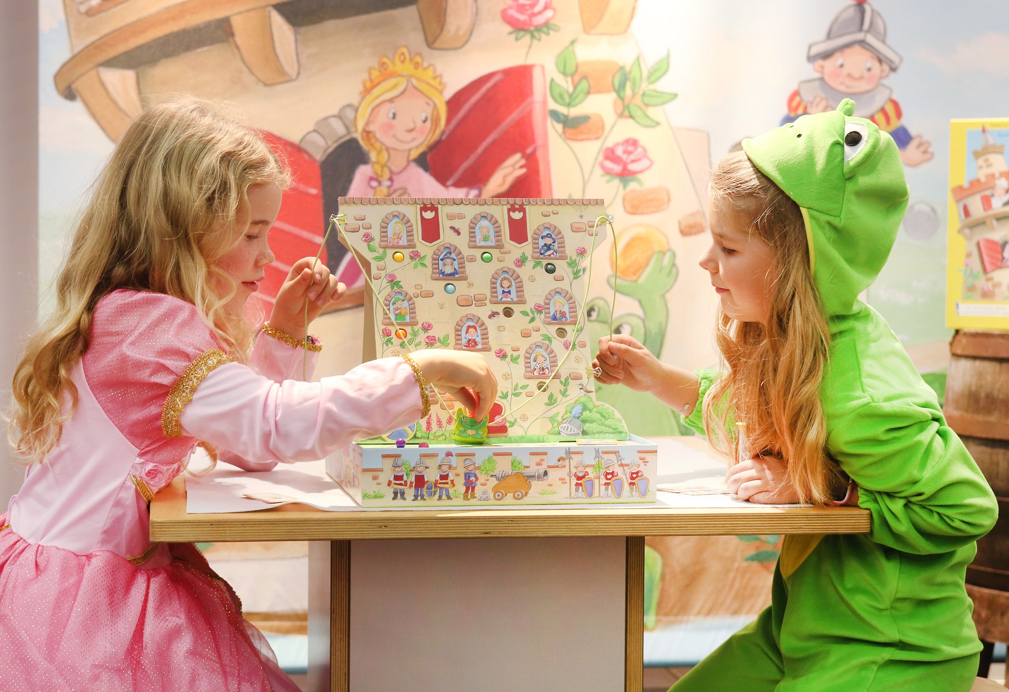 Das Spiel “Burg Kletterfrosch” von HABA testen am 25.10.2017 auf der Vorschau zur 35. Internationale Spieltage Messe in Essen (Nordrhein-Westfalen) zwei Kinder.