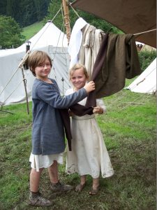 Entweder nähen ihre Eltern die Klamotten selber oder die Kleidung wird in einem speziellen „Ritter-Ausrüstungsladen“ bestellt. Das geht auch über das Internet. „Zuerst ziehe ich die Bruche an“, sagt Paul. Das ist eine knielange, weite Unterhose aus Leinen, die etwa bis zum Knie geht. Darüber kommen die Beinlinge aus Wolle. „Die kratzen leider ein bisschen.“ Die Beinlinge werden dann an der Bruche festgebunden. Oben drüber kommt bei Paul ein Leinenhemd oder bei Frieda ein Leinenkleid.