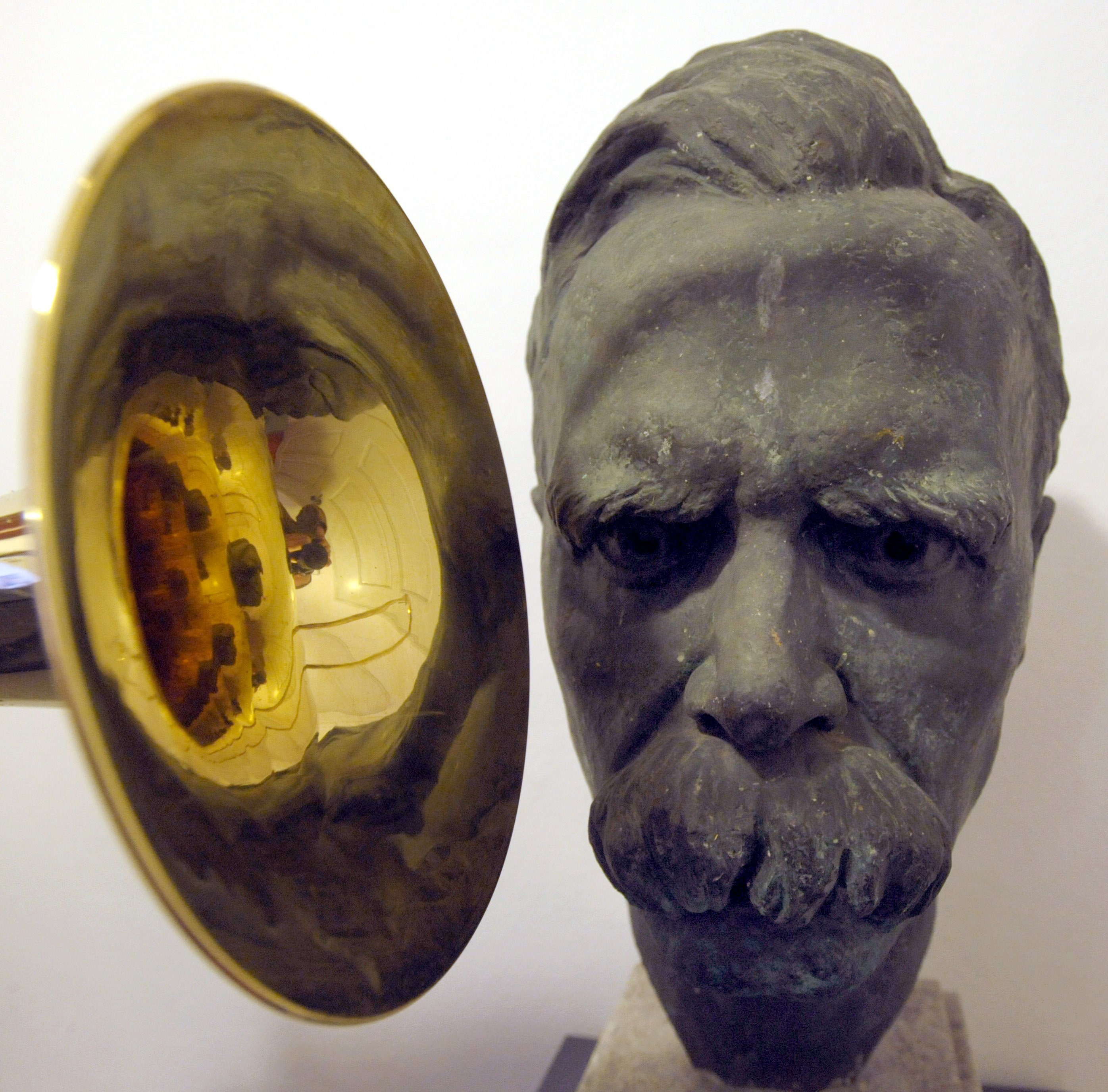 Neben der Büste des Philosophen Friedrich Nietzsche (1844-1900) spielt am Mittwoch (22.10.2008) ein Musiker auf einer Posaune im Nietzsche-Haus Naumburg (Burgenlandkreis in Sachsen-Anhalt). Am gleichen Tag ist neben dem Nietzsche-Haus der Grundstein für das Nietzsche-Dokumentationszentrum gelegt worden. Mit dem Dokumentationszentrum soll Nietzsche einer breiten Öffentlichkeit zugänglich gemacht werden. Die Fertigstellung des Baus für rund 2,7 Millionen Euro ist für Ende 2010 geplant. Kernstück ist die von der Stadt Naumburg für rund 150.000 Euro angekaufte Bibliothek des US-amerikanischen Germanisten Richard Frank Krummel zur Nietzsche-Rezeption im 20. Jahrhundert. Foto: Peter Endig dpa/lah (zu dpa 0295 vom 22.10.2008) +++(c) dpa – Bildfunk+++