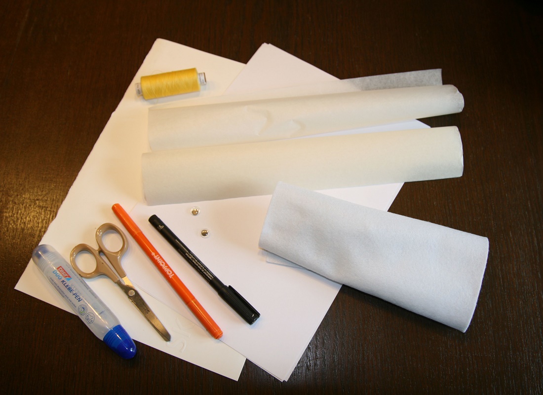 Für Hut und Kopf: aus schwarzer Pappe einen Zylinder ausschneiden. Für den Kopf mit einer kleinen Tasse (Durchmesser 5 cm) einen Kreis aus der weißen Pappe und dem Filz ausschneiden.