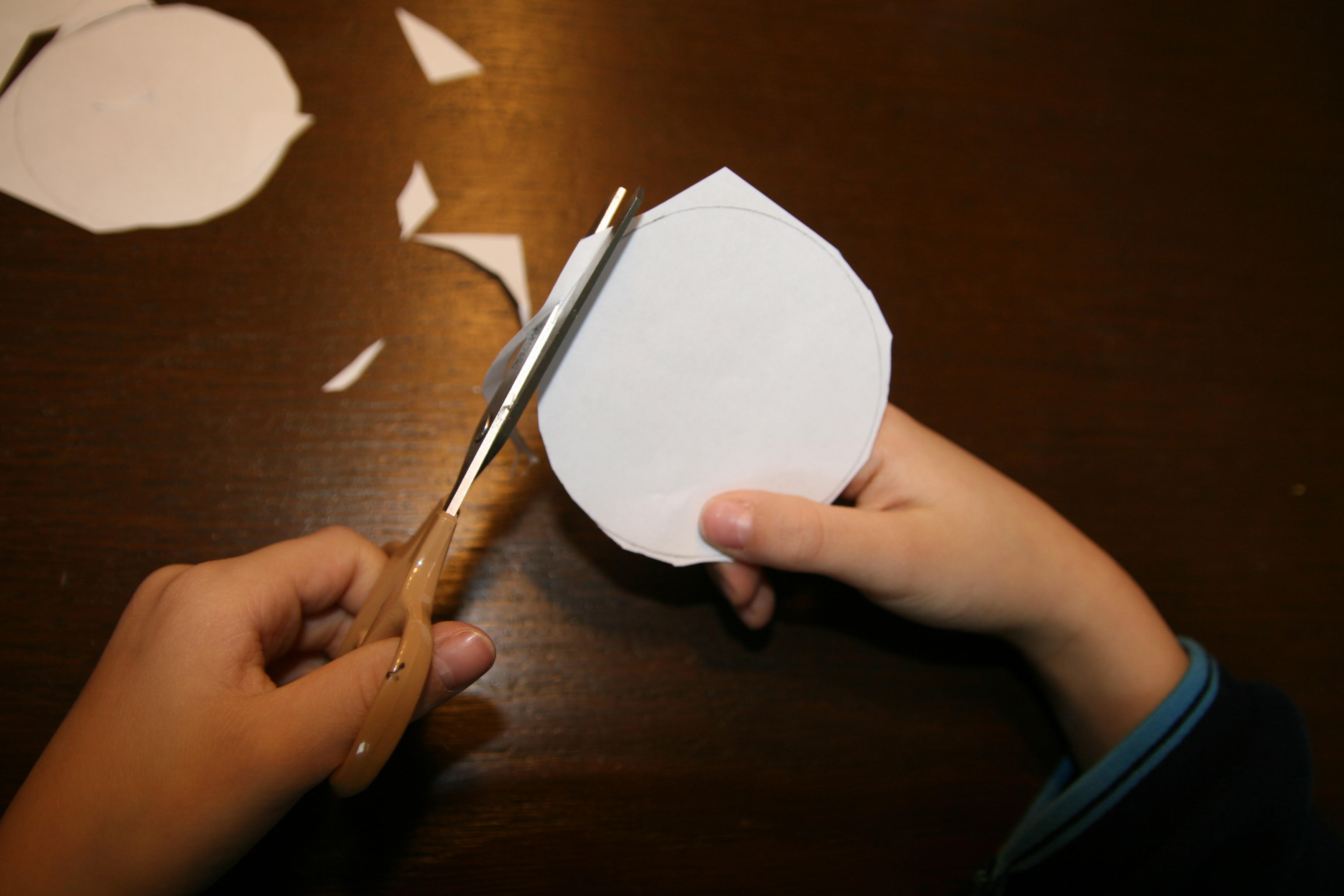 Für den Bauch: Schneide mindestens zehn Kreise (Durchmesser 8 cm) aus den beiden Blättern Papier. Als Schablone kannst du dafür eine Tasse nehmen. Tipp: Aus hellem Geschenkpapier noch weitere Kreise ausschneiden, dann sieht der Bauch des Schneemanns besonders hübsch aus. Die verschiedenen Papierscheiben abwechselnd übereinander legen.
