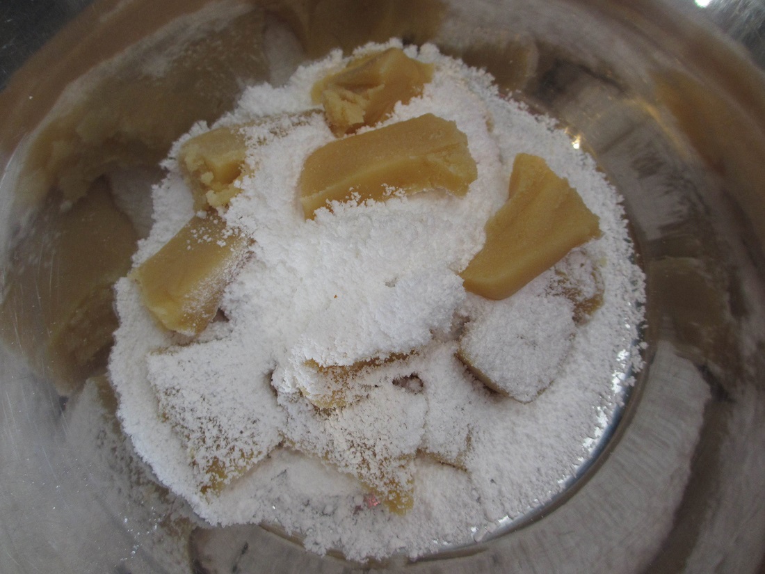 - Gib als erstes die Marzipanrohmasse in kleinen Stücken in eine Schüssel und verknete sie mit dem gesiebten Puderzucker zu einem glatten Teig.