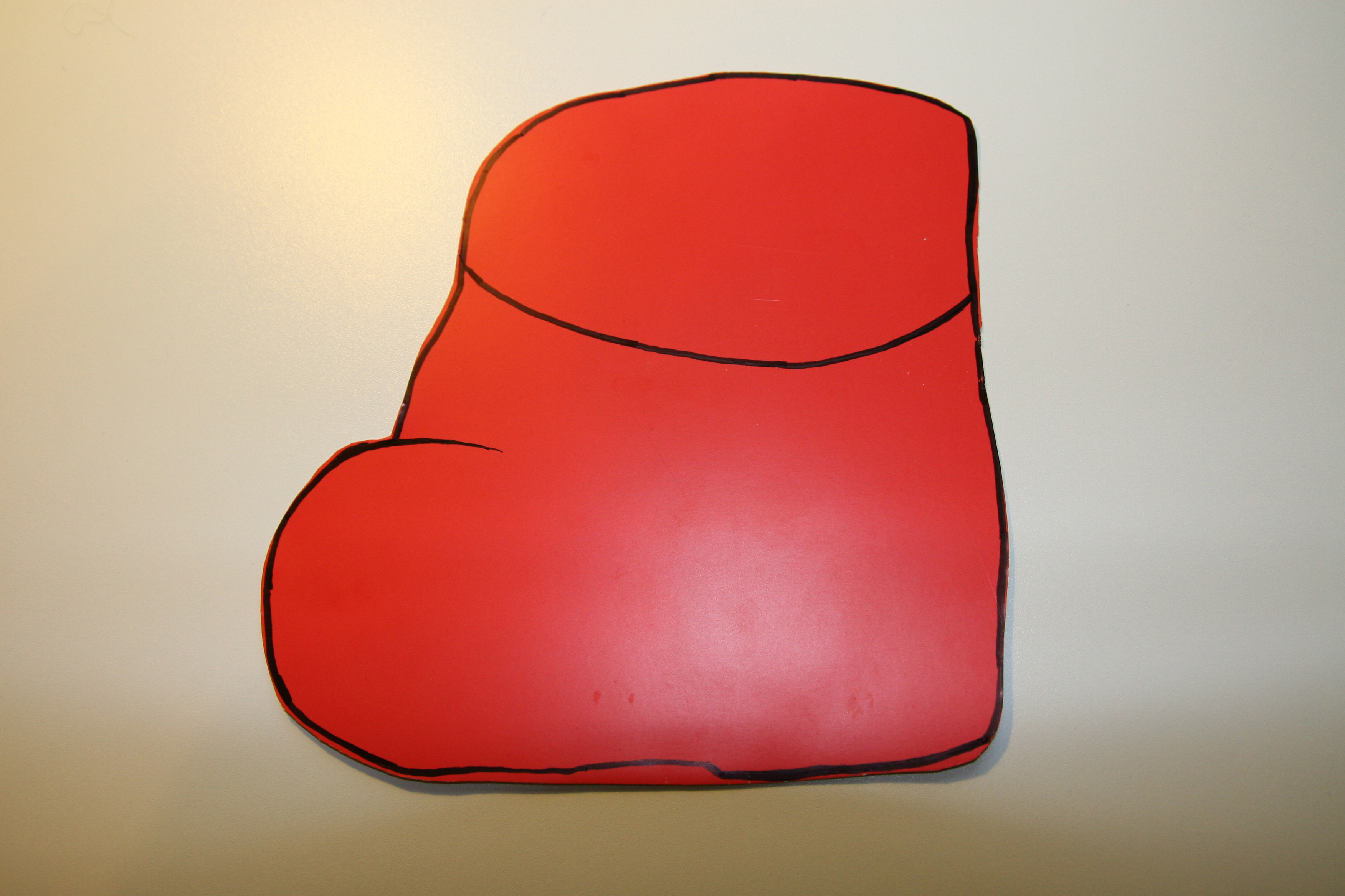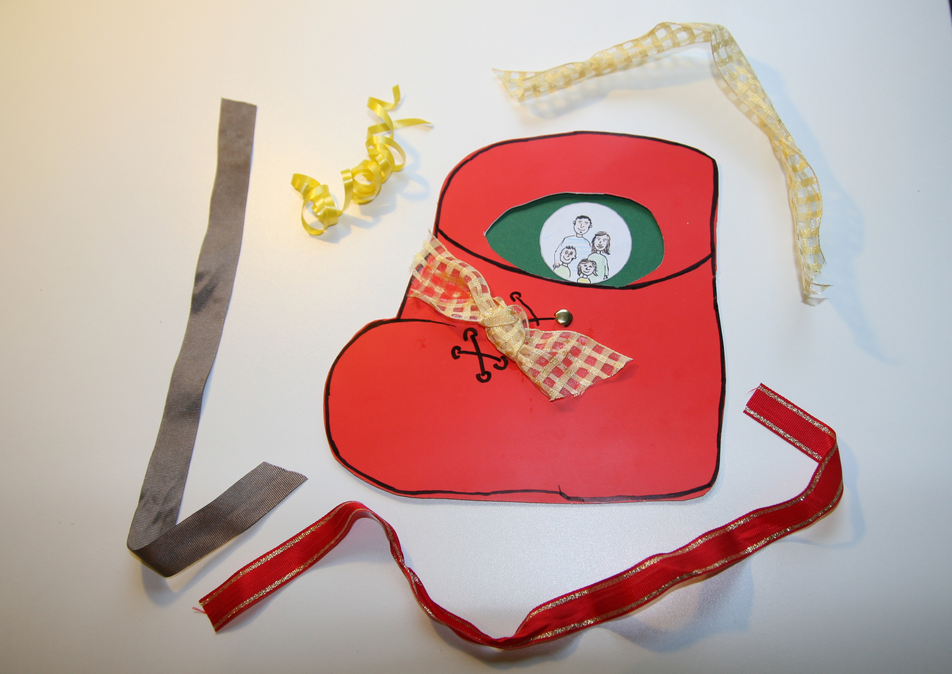 3. In den roten Stiefel schneiden wir ein ovales Fenster. Achtung: die Größe und die Stelle des Fensters anpassen an die Lage der Bilder auf der grünen Pappscheibe. Dafür legst du beide nebeneinander und misst den Abstand ab. Zum Schluss noch jeweils ein Loch durch die Mitte der beiden Pappen pieksen, beide übereinanderlegen und die Musterklammer durchziehen.