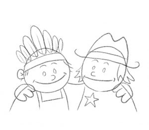 Jetzt wird es karnevalistisch: Das Kind links bekommt Indianerschmuck auf den Kopf, das Kind rechts einen Cowboyhut. Zeichne auch die Hände, die auf den Schultern liegen.