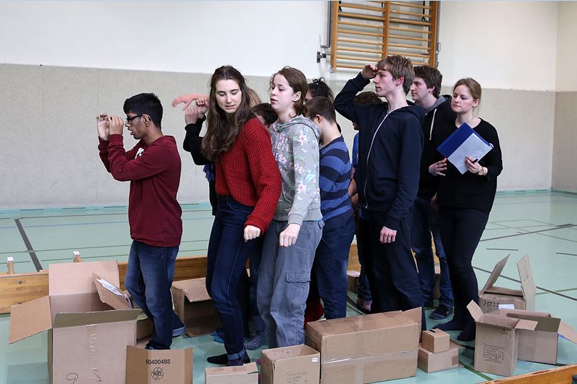 Bei den Proben für das Musiktheaterstück geht es noch etwas wuselig zu. Einige Kinder hampeln herum oder setzen sich einen der Pappkartons auf den Kopf. Doch sobald die Musiker ihre Instrumente erklingen lassen, sind die Schauspieler wieder konzentriert bei der Sache. „Ich bin der König!“, ruft Kai. Die anderen verbeugen sich vor ihm. „Gut, aber ich brauche noch mehr Aktion auf der Bühne“, sagt die Theaterpädagogin.
