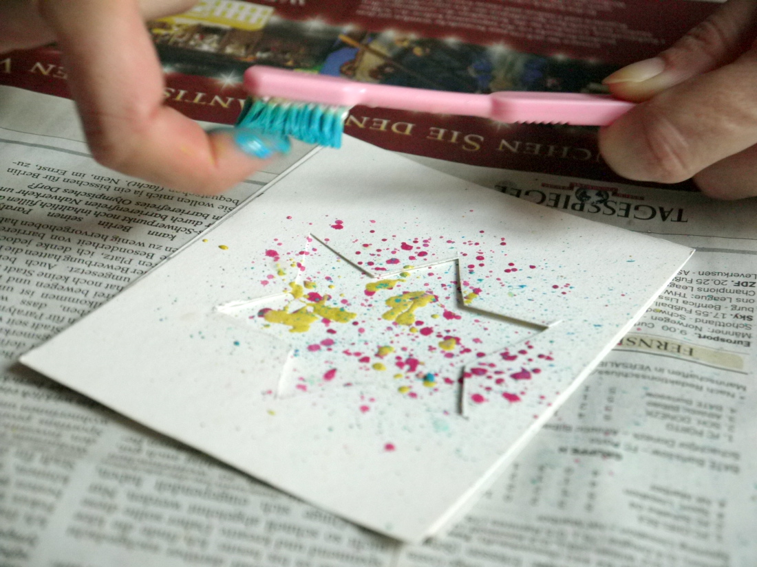 In einer Wohnung in Berlin liegen Materialien zum Basteln einer Weihnachtskarte auf dem Tisch, aufgenommen am 27.11.2014. Bei dieser Weihnachtskarte kommt es auf die Kleckse an. Foto: Alexandra Stober. ACHTUNG: Honorarfrei nur für Bezieher des Dienstes dpa-Nachrichten für Kinder.? +++(c) dpa – Nachrichten für Kinder+++