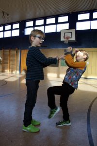 „Besonders Spaß machen mir die Befreiungsgriffe“, erzählt Noah. Ein Griff trägt einen besonders coolen Namen: Haifisch-Griff. Mit dem kann man sich aus dem Griff eines anderen befreien, ohne zuzuschlagen. „Warum ist es blöd, in einer solchen Situation zu hauen?“, fragt Herr Rudolph. „Weil Kinder, die hauen und treten, selbst irgendwann gehauen werden“, antwortet eine Schülerin. Und ein anderes Kind ergänzt: „Außerdem kriegt man dann den ganzen Ärger, obwohl man gar nicht angefangen hat.“ Diese Griffe klappen sogar bei stärkeren Gegnern. Selbst aus dem Griff des Profi-Boxers können sich die Kinder befreien. „Wenn man das drauf hat, braucht man keine Angst haben, wenn man dann wirklich mal in eine brenzlige Situation kommt“, sagt Lukas Paszkowsky.