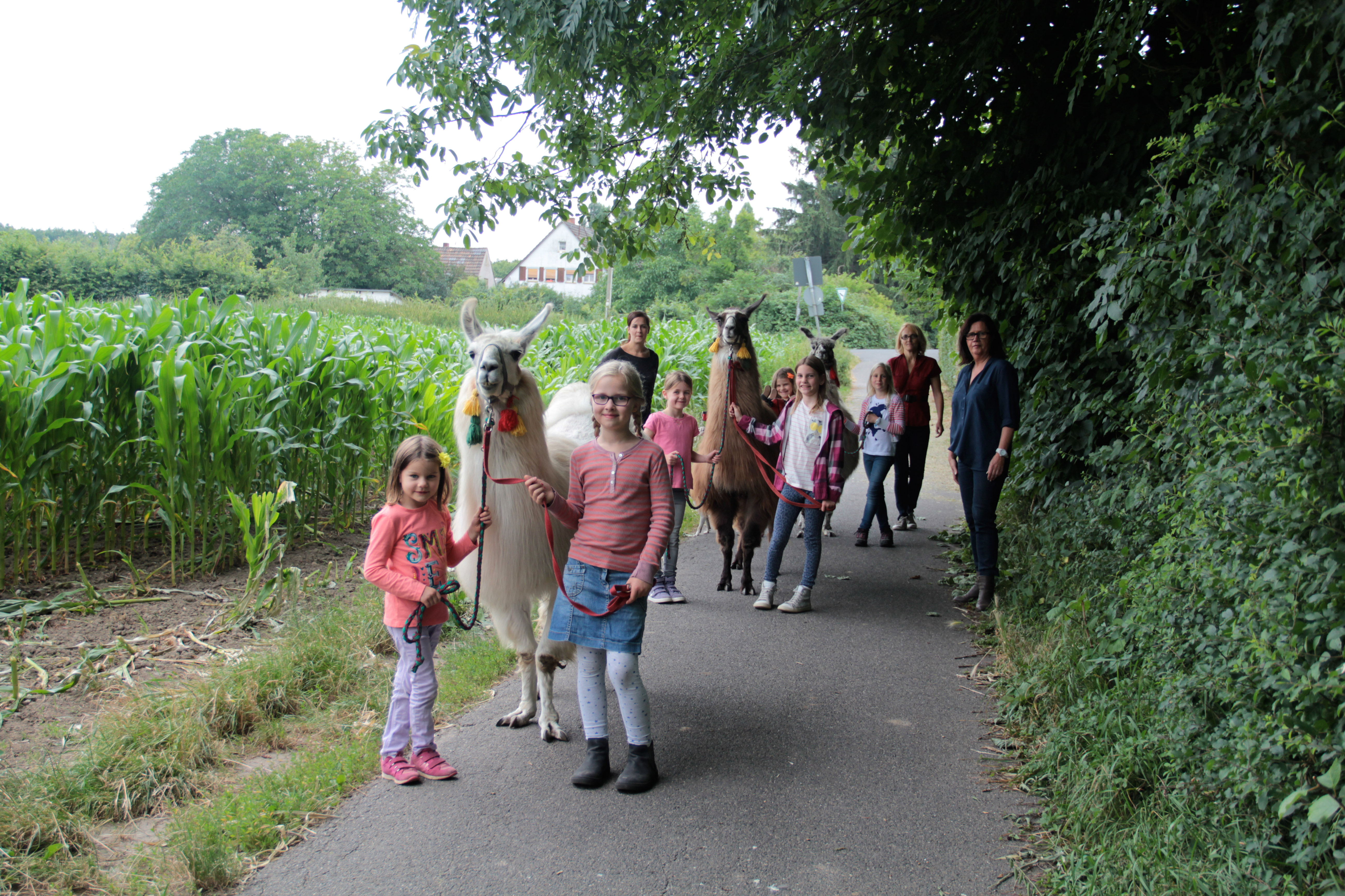 “Eigentlich sind die Lamas ja Fluchttiere, aber auf dem Spaziergang waren sie meistens ganz ruhig”, sagt die achtjährige Charlin. Fluchttiere sind Tiere, die bei einer drohenden Gefahr sehr schnell wegrennen. Die Mädchen sind sich nicht einig, ob sie Charango, Den Großen Weißen oder Tiamo de Uoro am liebsten mögen, aber sie sagen alle, dass sie selbst gerne ein eigenes Lama hätten. Bis sie ihre Eltern davon überzeugt haben, kommen sie weiter auf den kleinen Hof und gehen mit den Tieren spazieren.