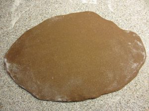 5. Am nächsten Tag legst du den gekühlten Teig auf eine bemehlte Fläche. Rolle ihn mit der Teigrolle aus. Wenn dir der Teig noch zu hart ist, dann lässt du ihn einfach ein paar Minuten liegen, dann wird er wieder wärmer und dadurch auch weicher.