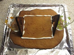 2. Nun befestigst du die Lebkuchenteile für die Vor- und Rückwand mit Hilfe des Zuckergusses auf dem Grundstück. Als nächstes legst du das Dach auf die Wände und befestigst es ebenfalls mit Zuckerguss. Jetzt spritzt du die Ecken und Kanten noch einmal mit Zuckerguss aus.