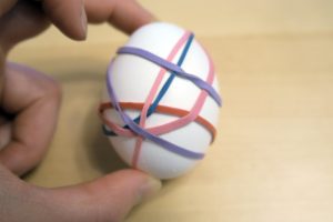 Bei diesem Osterei sorgen Gummibänder beim Färben für ungewöhnliche Muster. Foto: Ginette Haußmann/dpa