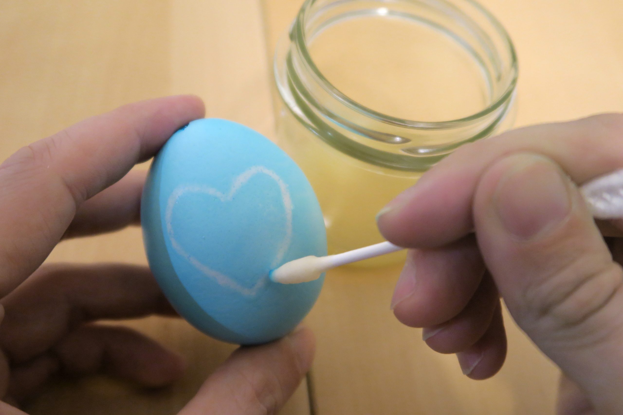 In bereits gefärbte Eier lassen sich mit Zitronensaft neue Bilder zaubern. An den bemalten Stellen verschwindet dann die Farbe oder sie verändert sich. Tauche einfach ein Wattestäbchen in Zitronensaft und male mit dem Stäbchen auf das Ei. Aber nimm nicht zu viel Zitronensaft! Sonst tropft er am Ei hinunter, das Bild verschmiert.