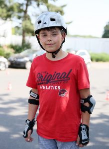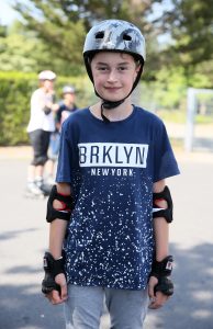 Bei mir zuhause fahre ich manchmal mit Skates um den Block und in meiner Straße. Ich fahre auch gerne Schlittschuh. Das, was ich hier im Kurs gelernt habe, hilft mir bestimmt auch dabei, schneller Schlittschuh zu fahren. Der Leiter hat uns gezeigt, wie wir mit dem Stopper bremsen können oder auf den Knien. Ich finde, er hat das alles gut erklärt.