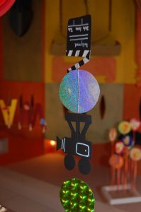 Du kannst dir zum Beispiel drei verschiedene Motive aussuchen, die sich an der Girlande immer wiederholen. Die Kinder, die die Girlanden auf dem Bild rechts gebastelt haben, haben sich für Filmrollen, Filmklappen und Kreise aus Glitzerpapier entschieden. Du kannst aber auch nur ein einziges Motiv nehmen, das du in drei verschiedenen Farben ausschneidest. Oder du kannst Buchstaben ausschneiden, sie hintereinander aufhängen – und schon entsteht ein ganzes Wort.