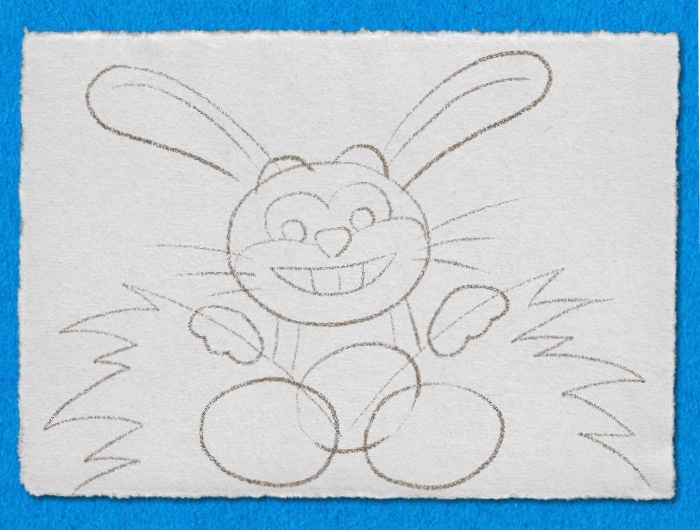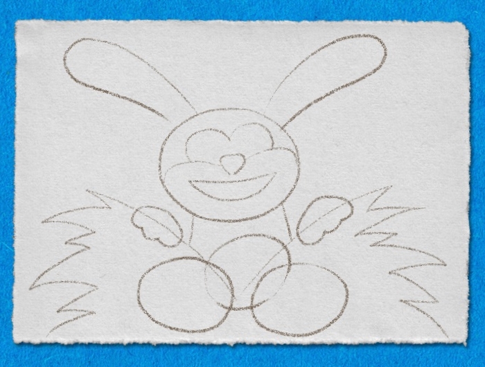 Der Anfang: Nimm einen Bleistift und zeichne vorsichtig die ersten Umrisse: Gras, Hasengesicht, Ohren, Hals, Nase.