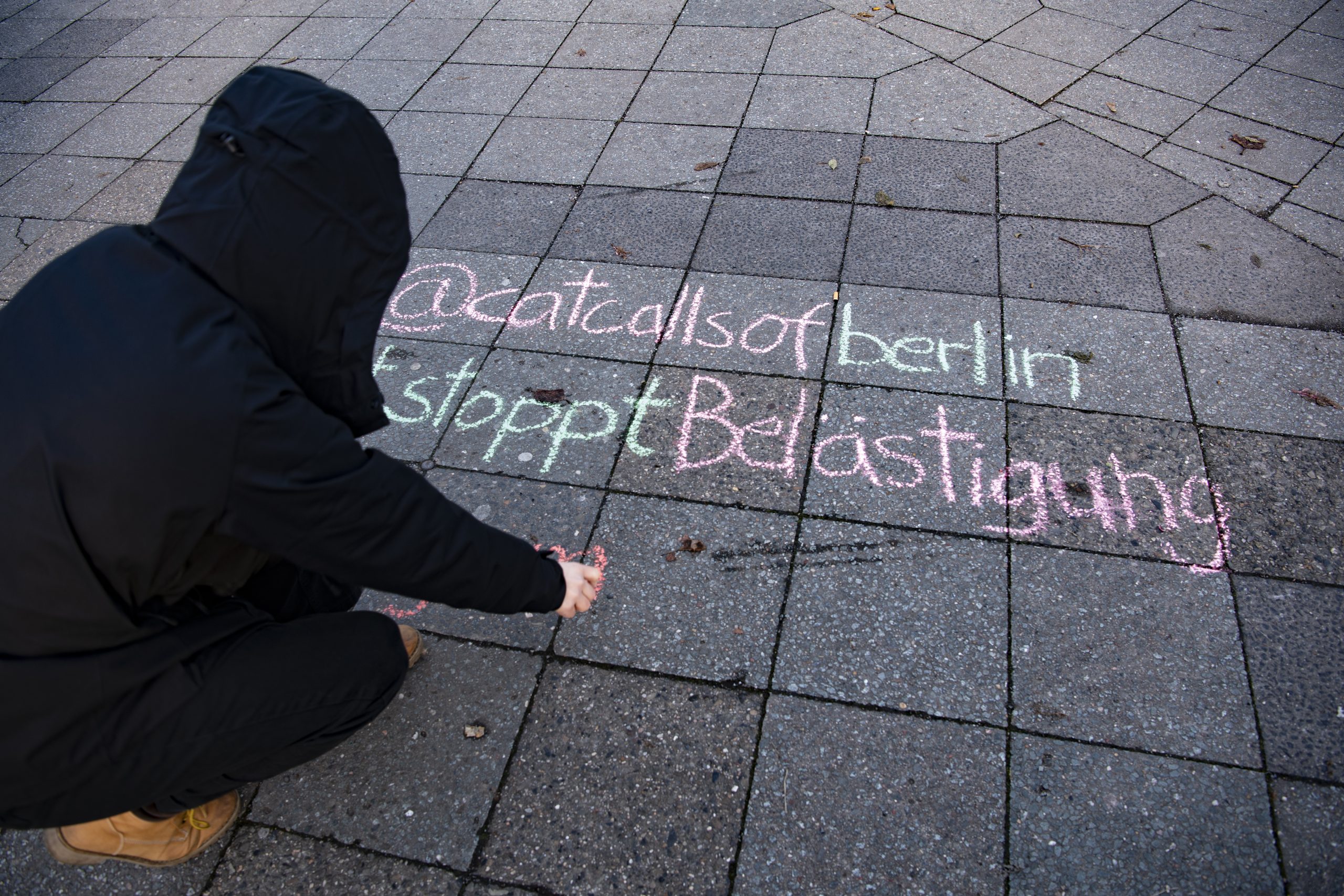 Mit Kreide schreiben Frauen in verschiedenen Städten fiese Sprüche auf die Straßen. Sie wollen so auf das Problem Catcalling aufmerksam machen. Foto: Paul Zinken/dpa