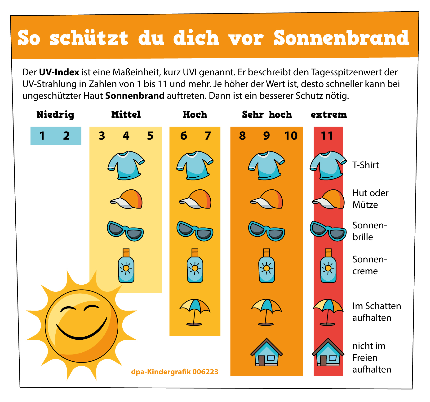 Doch woher weiß man, wann man sich unbedingt schützen muss? Man kann UV-Strahlen nicht sehen, aber messen. Das passiert den ganzen Tag an 38 Messstellen in Deutschland mit speziellen Geräten. Die stehen an Orten, wo kein Schatten hinkommt, zum Beispiel auf Dächern. „Wenn wir die Messwerte haben, können wir daraus den UV-Index berechnen“, sagt Frau Baldermann. Das ist eine Zahl von 1 bis 11 oder höher. Es gilt: Je höher die Zahl ist, desto größer ist die UV-Belastung.