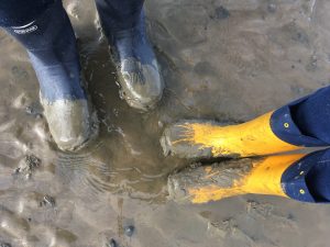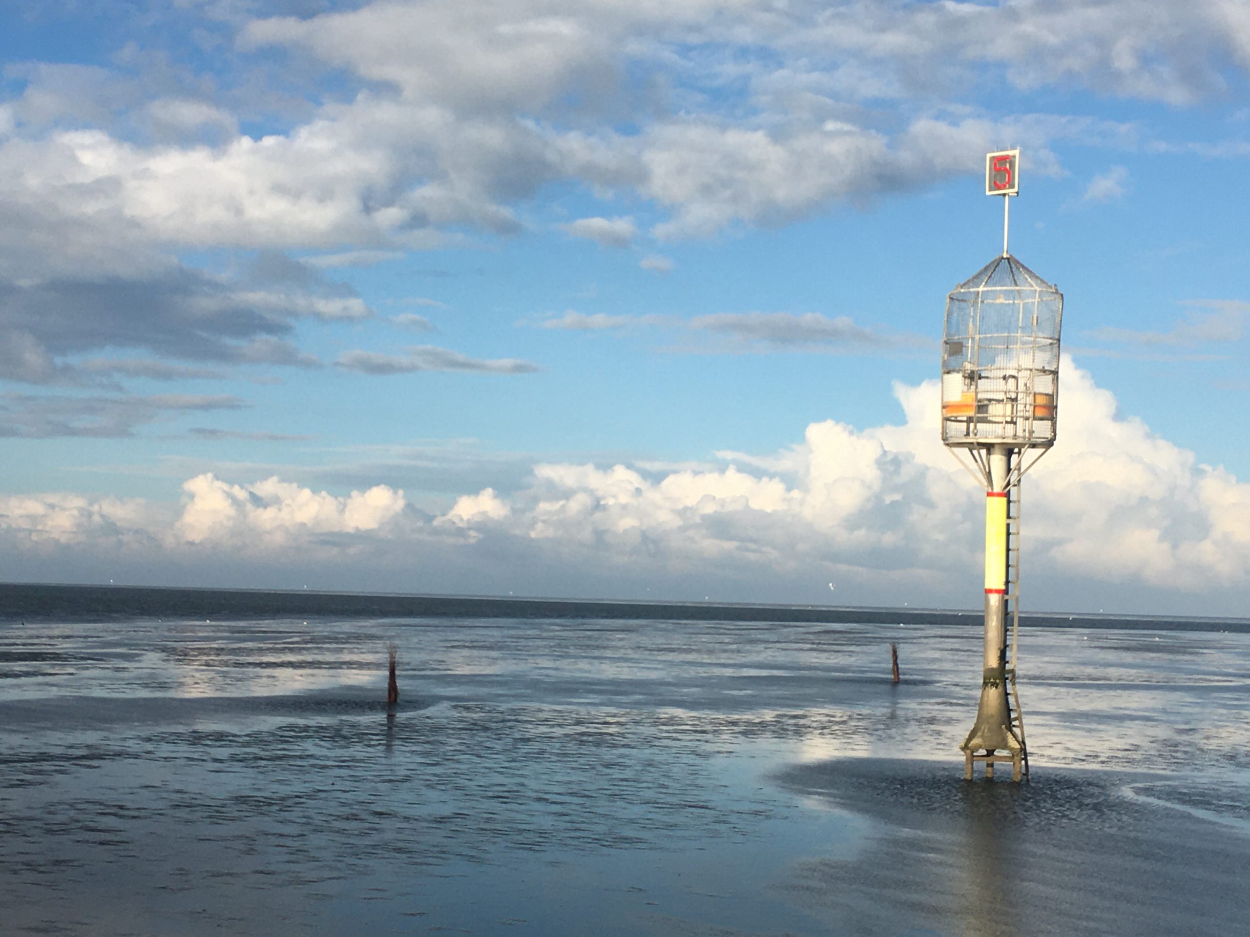 Hier ist ja gar kein Wasser! Wer in der Nordsee baden möchte, sollte vorher auf einen Gezeiten-Kalender gucken. Denn dort herrschen Ebbe und Flut. Bei Ebbe ist das Baden schwierig. Das Wasser zieht sich zurück und die Nordsee sieht aus wie eine große nasse Wüste. Das, was man da sieht, wird Watt genannt.