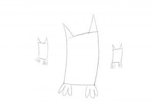 Zeichne ein großes und zwei kleine Rechtecke. Oben fügst du spitze Ohren hinzu, unten Füße.