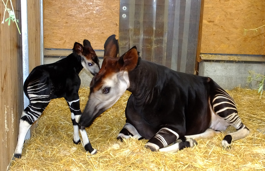 - Kinder: Eine feste Paarungszeit gibt es bei den Okapis nicht. Denn im Regenwald ist es ja immer ungefähr gleich warm – deswegen können die Babys zu jeder Jahreszeit auf die Welt kommen. Das Weibchen bekommt meistens ein Junges, das schon eine halbe Stunde nach der Geburt stehen und nach zwei Tagen gut laufen kann. Meistens bleiben die Kinder aber ein paar Wochen in einem Versteck. Zunächst trinken sie nur Milch bei der Mutter, später fressen sie auch selbst Blätter. Nach 1,5 Jahren sind die kleinen Okapis erwachsen und verlassen ihre Mutter. Die Tiere werden ungefähr 20 Jahre alt.