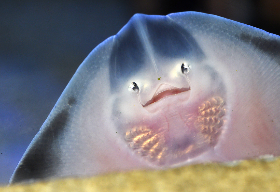 auf dem Bild rechts sehen kannst. Aber die Punkte über dem Mund sind keine Augen – sondern seine Nasenlöcher. Am schlanken Rochen-Schwanz wachsen nur kleine Flossen. Die Größe der verschiedenen Rochen-Arten unterscheidet sich sehr: Manche Arten sind nur 20 Zentimeter lang, andere, wie der Teufelsrochen, können bis zu sieben Meter lang und bis zu 3000 Kilogramm schwer werden.
