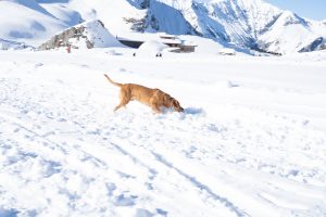 Hündin Woya sitzt ruhig neben ihrem Frauchen Karin Schmid und wartet auf ihren Einsatz. „Hier ist eine Lawine abgerutscht. Zwei Personen werden vermisst“, sagt der Einsatzleiter. Doch keine Sorge! Er hat sich diesen Notfall nur ausgedacht. Denn wir sind bei einem Training für Lawinenrettungshunde in der Schweiz.