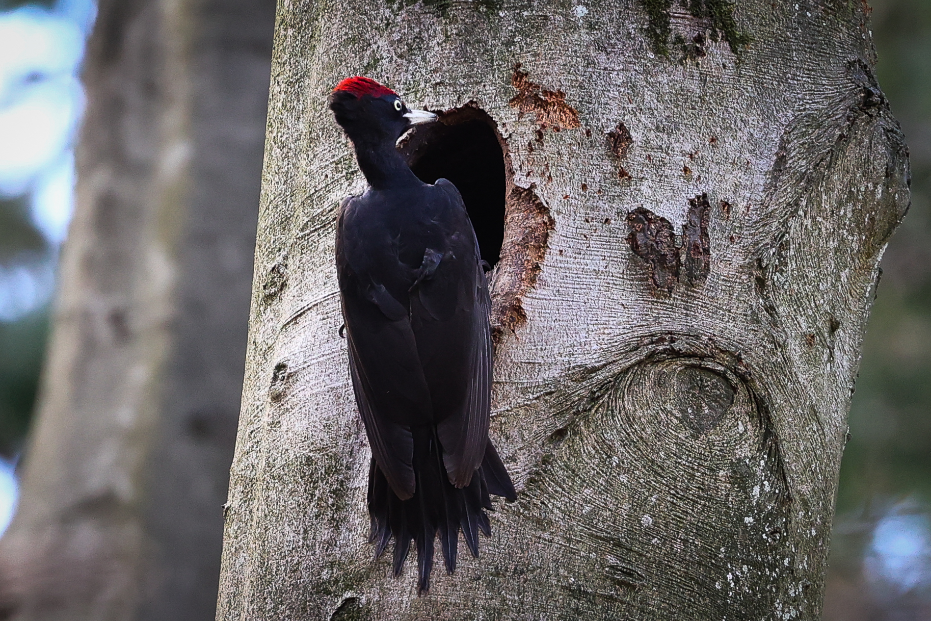 Ein Stück weiter bleibt Herr Reschke vor einer großen Buche stehen. Weit oben ist ein großes Loch im Stamm zu sehen. „Das ist die Höhle eines Schwarzspechts“, sagt er. Um diesen Vogel zu sehen, müsse man sich hinsetzen und warten. Das macht Herr Reschke sowieso gern. „Wenn man eine Weile still an einem Ort sitzt, nehmen die Vögel einen als Teil der Umgebung wahr. Dann kommen sie ganz nah an einen ran.“