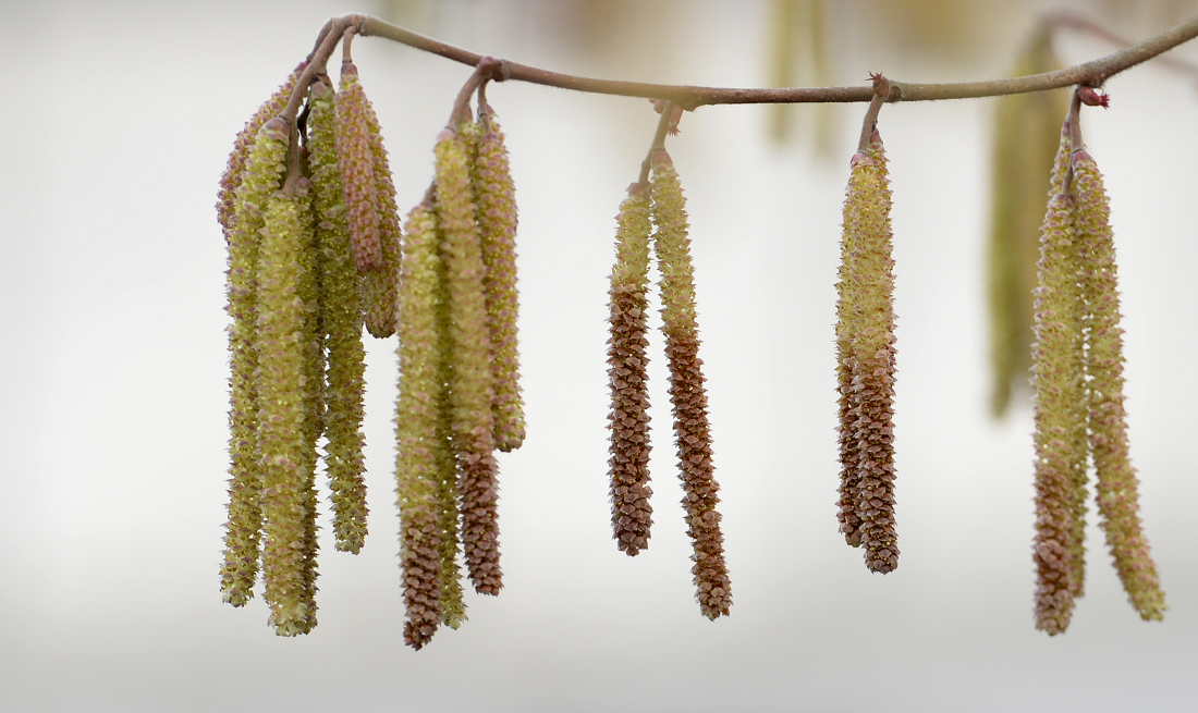 Auch der Haselnussstrauch beginnt zu blühen – wenn du gegen diese Pollen allergisch bist und davon niesen musst, wirst du das spüren. An den noch blätterlosen Zweigen hängen nun die länglichen gelben Blütenkätzchen.
