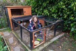 Für Kaninchen braucht man viel Zeit: Ich miste einmal in der Woche den kompletten Stall plus die Toilette aus, den Auslauf kehre ich alle drei Tage. Einmal pro Woche untersuche ich Fell, Zähne, Ohren und After. Die Krallen schneide ich etwa alle drei Monate. Außerdem lasse ich Wolke und Blitz täglich eine halbe Stunde frei durch den Garten hoppeln, denn Kaninchen brauchen viel Auslauf. Ehrlich gesagt, verbringe ich fast jede freie Minute mit den beiden, denn es macht mir viel Spaß, mich um sie zu kümmern.