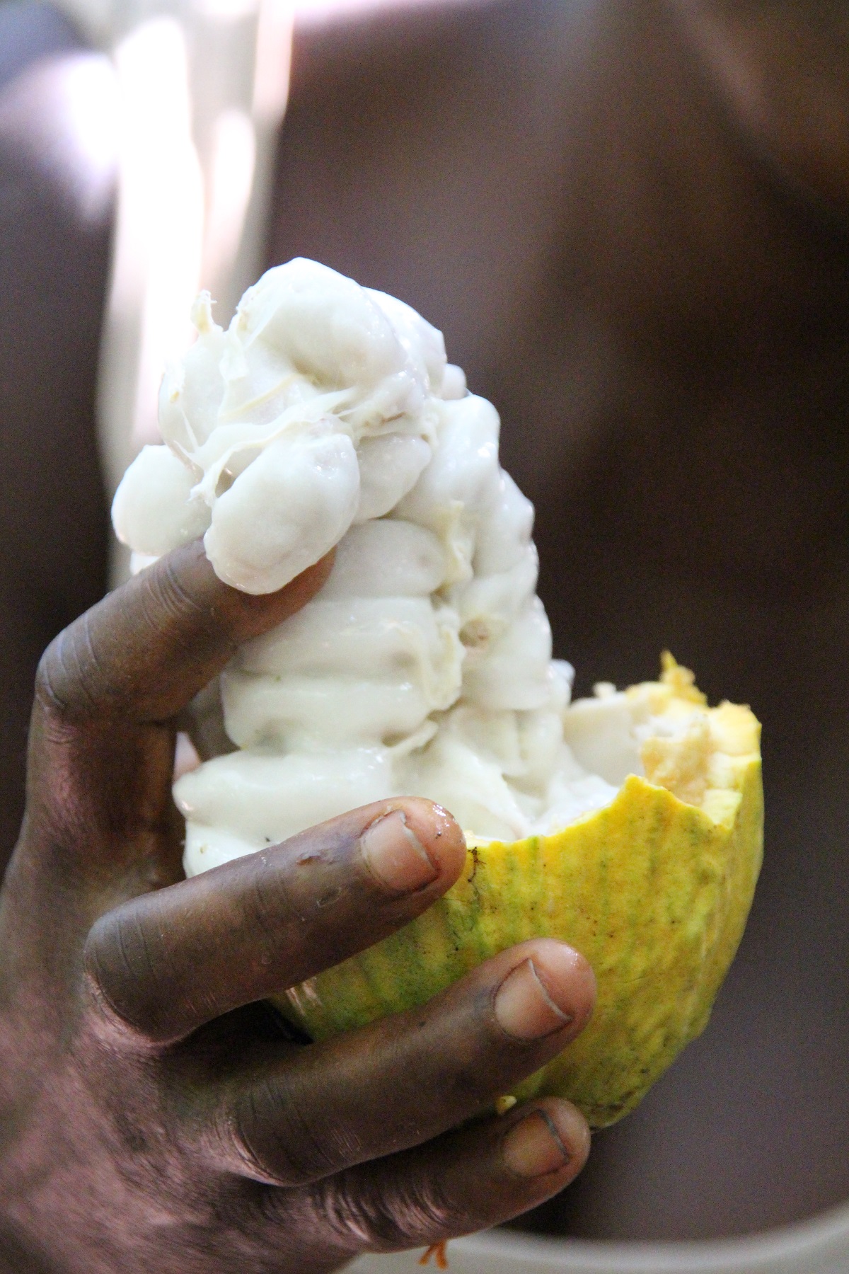 In der harten Kakao-Frucht befinden sich die Samen. Sie werden auch Kakaobohnen genannt. Die Bauern holen die Bohnen aus der Schale. Sie schmecken aber noch sehr bitter. Deswegen bleiben sie bis zu zehn Tage liegen. Dadurch verändern die Bohnen zum Beispiel ihren Geschmack. Sie riechen auch schon nach Kakao! Jetzt müssen sie nur noch in der Sonne trocknen.