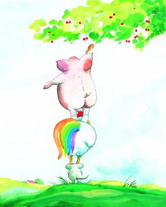 Wenn seine Figuren animiert werden! Tatsächlich ist es so, dass aus manchen Büchern und Zeichnungen Filme entstanden sind. Der Autor mag es am liebsten, wenn die Tiere so bleiben, wie sie sind. Der dicke Waldemar mit beweglichen Kulleraugen? Das fände er nicht gut. „Da wäre ich unglücklich. Und der dicke Waldemar auch.“
