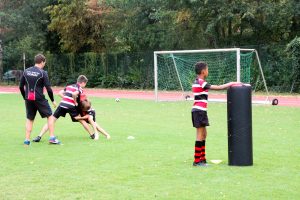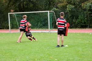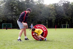 Wenn Kinder Rugby lernen, wird umso mehr auf die Sicherheit geachtet. „Bei den Junioren darf man sich nur von der Hüfte abwärts angreifen“, erklärt Gerald Gräfe. Die Erwachsenen hingegen attackieren sich von der Schulter abwärts. Es gibt auch eine Spielart, bei der man den Gegenspieler nur durch Antippen stoppt – fast wie beim Fangen.