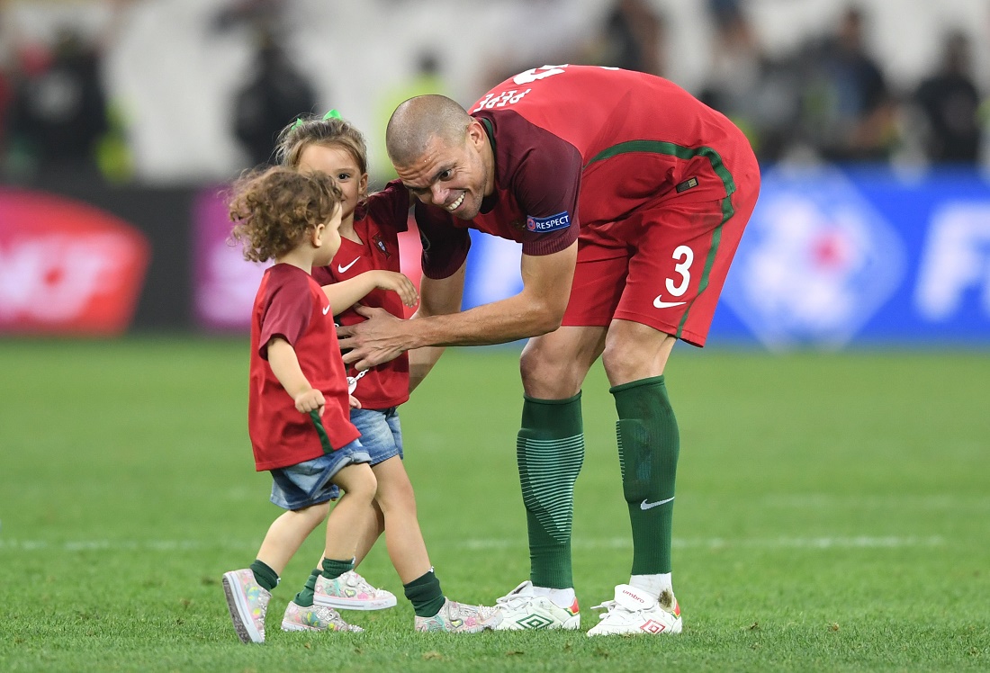 Bei seinen Töchtern macht er das natürlich nicht, lieber treibt er ein bisschen Blödsinn mit ihnen auf dem Platz, so wie hier nach dem Spiel gegen Polen. Pepe ist übrigens nur der Spitzname des Fußballers. Eigentlich heißt er Képler Laveran Lima Ferreira. Seine Töchter waren nicht die einzigen auf dem Platz: Nani, der auch bei Portugal spielt, kickte mit seinem Sohn noch eine Runde nach dem Sieg.