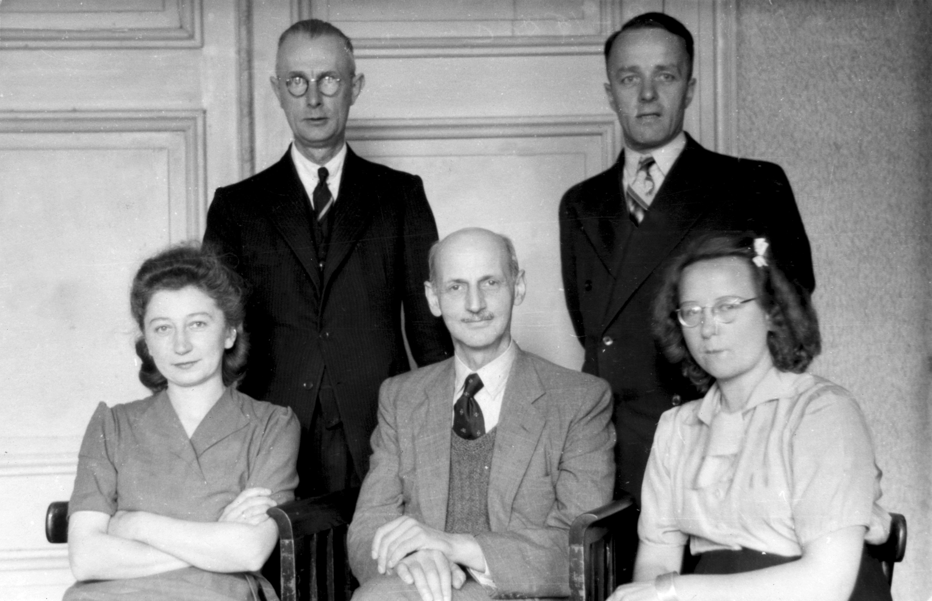 Miep Gies (R) posiert mit Annes Vater, Otto Frank (M), und den Helfern Bep Voskuil, Victor Kugler und Johannes Kleimann.. Foto: Anne Frank Haus Amsterdam