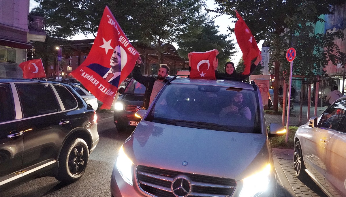 Anhänger des türkischen Präsidenten Erdogan fahren mit Türkeifahnen nach den ersten Hochrechnungen zur türkischen Parlaments- und Präsidentenwahl durch den Hamburger Stadtteil Wilhelmsburg. (Foto: dpa)