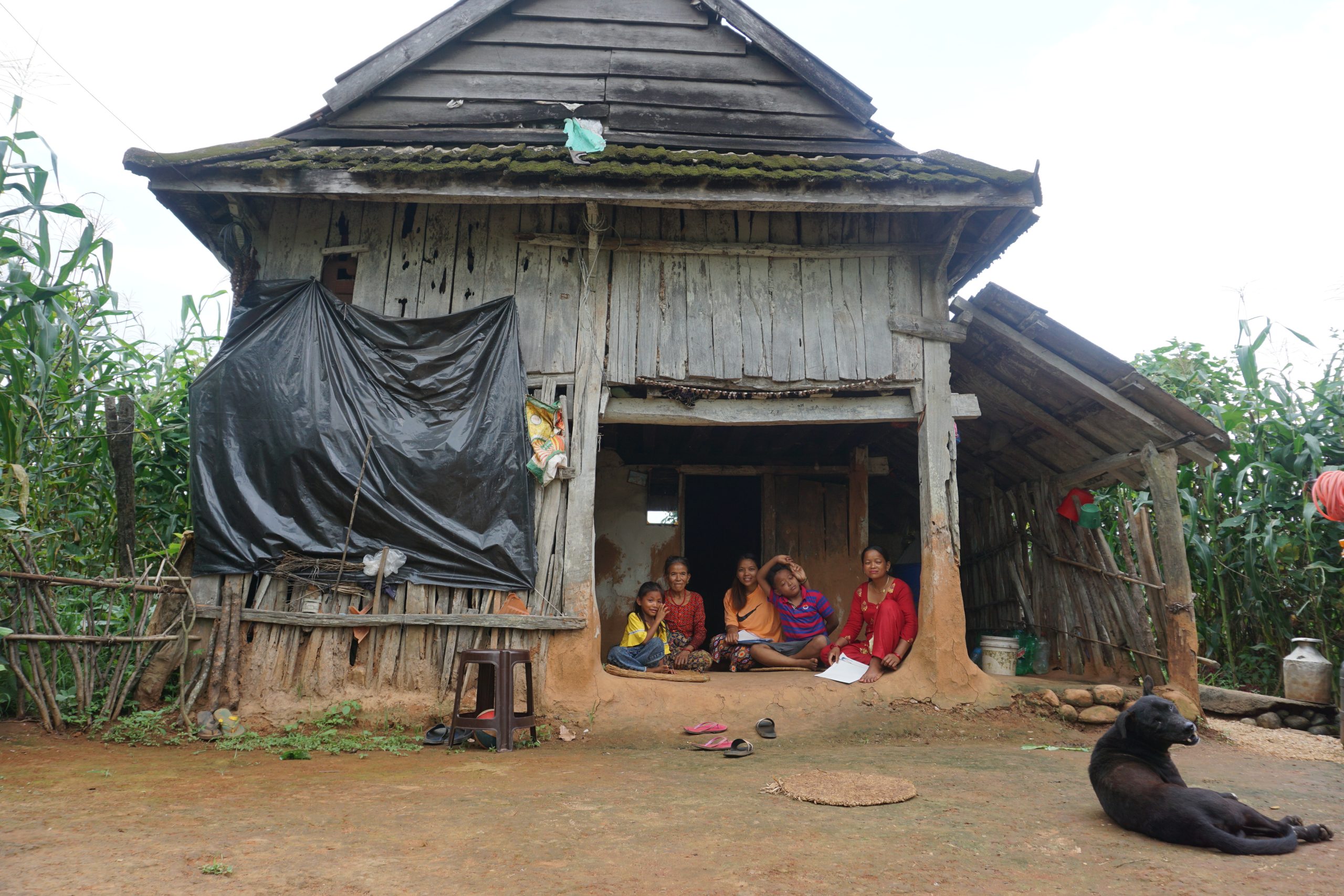 Niraj (zweiter von rechts) wohnt in dieser einfachen Hütte im Land Nepal. Foto: Anne-Sophie Galli/dpa